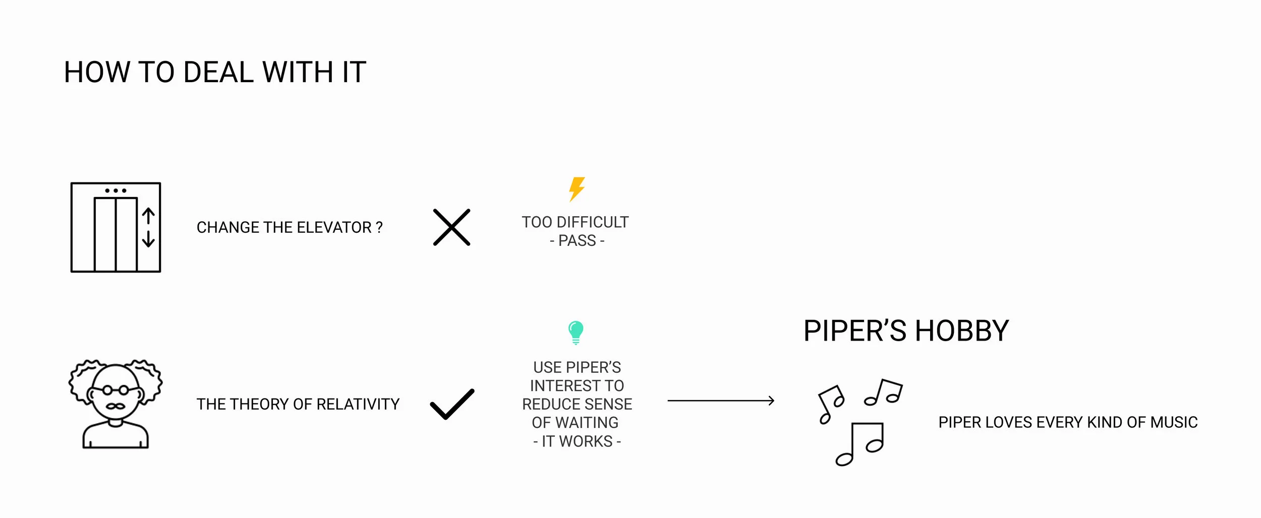 Piper is a graduate student at New York University, living in an apartment in Brooklyn. Also, she lives at a high-level building so she needs to use her building’s elevator every day. Piper thinks the elevator is too slow. It almost takes five minutes each time. It is a kind of waiting problem. Not only for the elevator and also for all public transportation.